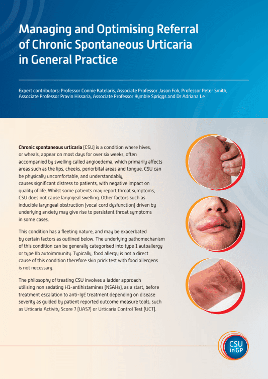 Review key findings from expert contributers regarding the Mangement and Optimal Referral of CSU in General Practice; with Professor Connie Katelaris, Associate Professor Jason Fok, Professor Peter Smith, Associate Professor Pravin Hissaria, Associate Professor Kymble Spriggs and Dr Adriana Le.